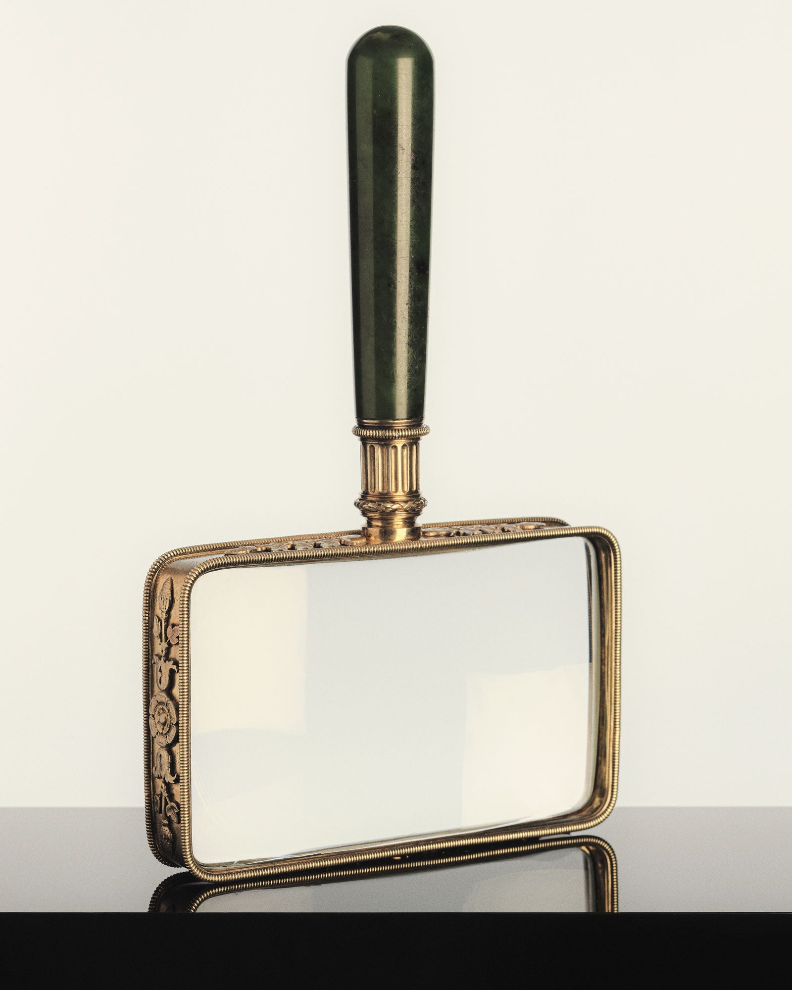 A silver-gilt and nephrite magnifying glass by Viktor Aarne for Fabergé, late 19th century, with rosettes, oak leaves, and pine cone finials. Handle carved from polished nephrite. Marked for Aarne, Fabergé’s St. Petersburg workmaster. The piece measures 6.75 by 4.25 inches.